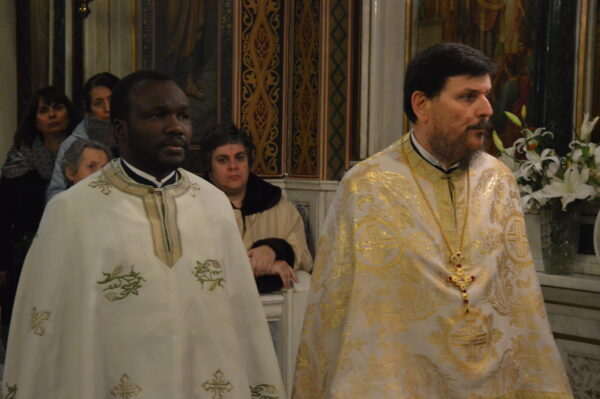 Σχετικὰ μὲ τὴν πανήγυρη τῆς Ἁγίας Ζώνης τοῦ 1862 ἔγραψε ἡ ἐκδιδόμενη τότε στὴν Ἀθήνα ἐφημερίδα «Ὁ Ἐθνοφύλαξ», κατὰ τὴν ὁποία «ὁ μουσικολογιώτατος ἐφημέριος τῆς εἰρημένης ἐκκλησίας ἡδέως ἔψαλεν ρωσιστὶ καὶ ἑλληνιστὶ τὸ δόξα σοι ὁ Θεὸς ἡμῶν δόξα σοι». Πρόκειται γιὰ τὸν σπουδαῖο ἁγιογράφο Γεννάδιο Παπαδόπουλο, ὁ ὁποῖος εἶχε σπουδάσει ζωγραφικὴ στὴ Μόσχα καὶ στὸ Ἅγιον Ὅρος καὶ ἀπὸ τὸ 1850 μόναζε στὴ Μονὴ Πετράκη. Ὁ ἱερομάναχος αὐτὸς ζωγράφισε τὶς τέσσερις εἰκόνες τοῦ τέμπλου τῆς ἐκκλησίας (οἱ ὁποῖες ἀργότερα «διορθώθηκαν» καὶ ἔτσι ἔχασαν τὴν ἀξία τους), ἀναφέρεται μάλιστα ὅτι τὴν ἐργασία του παρακολουθοῦσε ὅλη ἡ οἰκογένεια Ὀζερὼφ καί, ὅταν σὲ μία φάση τοῦ ζήτησαν τὴ λύση κάποιας ἀπορίας, ὁ Γεννάδιος ἀπάντησε στὰ ρωσικὰ καὶ ἀπὸ τότε διορίσθηκε ἐφημέριος τοῦ ναοῦ, μισθοδοτούμενος ἀπὸ τὸν πρεσβευτή. Ἀπεβίωσε τὸ 1864 καὶ ἐτάφη στὸ προαύλιο τῆς ἐκκλησίας. Λίγο χρόνο μετὰ τὴν ὁλοκλήρωσή της ἡ ἐκκλησία ἔγινε ἐνοριακή.