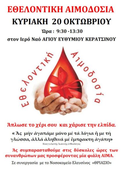 “Άπλωσε το χέρι σου και χάρισε την ελπίδα” είναι το σύνθημα της Εθελοντικής Αιμοδοσίας που διοργανώνει την Κυριακή 20 Οκτωβρίου ο Ιερός Ναός Αγίου Ευθυμίου Κερατσινίου.