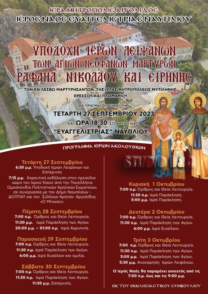 Ο Ιερός Ναός Ευαγγελίστριας Ναυπλίου θα υποδεχθεί τα Ιερά Λείψανα των Αγίων νεοφανών Μαρτύρων Ραφαήλ, Νικολάου και Ειρήνης από το νησί της Λέσβου την Τετάρτη 27 Σεπτεμβρίου 2023 στις 6:30 μ.μ.