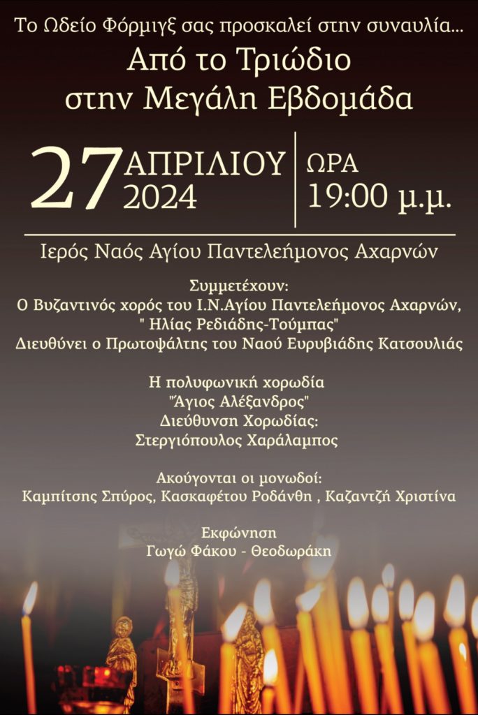Το Ωδείο Φόρμιγξ απευθύνει πρόσκληση στην συναυλία «Από το Τριώδιο στην Μεγάλη Εβδομάδα» που θα διεξαχθεί το Σάββατο 27 Απριλίου στις 19:00 στον Ιερό Ναό Αγίου Παντελεήμονος Αχαρνών, με τη συμμετοχή Βυζαντινών χορωδιακών σχημάτων, που θα εντάξουν το κοινό στις ιερές ακολουθίες και τα Θεία πάθη της Μεγάλης Εβδομάδας.