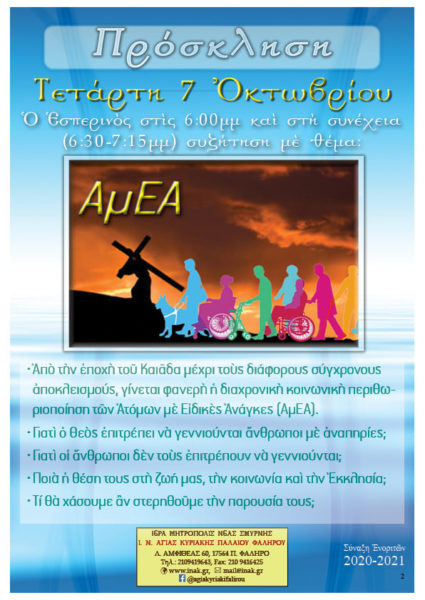 Το πολύ ενδιαφέρον θέμα του αποκλεισμού των ανθρώπων με ειδικές ανάγκες από την εποχή του Καιάδα μέχρι σήμερα θα αναπτυχθεί αύριο το απόγευμα, Τετάρτης 7 Οκτωβρίου, στον Ιερό Ναό Αγίας Κυριακής Παλαιού Φαλήρου, μετά τον Εσπερινό. Ο ομιλητής θα προσπαθήσει να δώσει απαντήσεις σε ερωτήματα όπως το γιατί ο Θεός επιτρέπει να γεννιούνται άνθρωποι με αναπηρίες, γιατί κάποιοι άνθρωποι δεν επιτρέπουν να γεννιούνται παιδιά με αναπηρίες, αλλά και τι θα χάσουμε αν στερηθούμε την παρουσία τους.