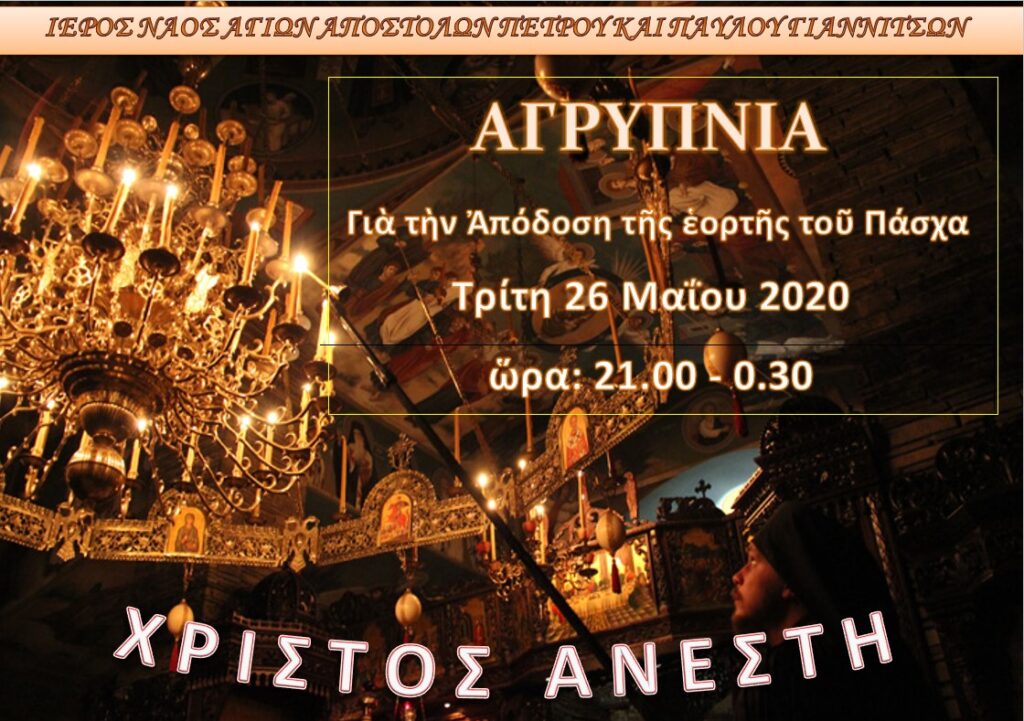 Την Τρίτη 26 Μαΐου, από ώρα 21.00 έως 0.30, στον Ι. Ναό Αγίων Αποστόλων Πέτρου και Παύλου Γιαννιτσών θα τελεσθεί Ιερά Αγρυπνία για την Απόδοση της εορτής του Πάσχα.
