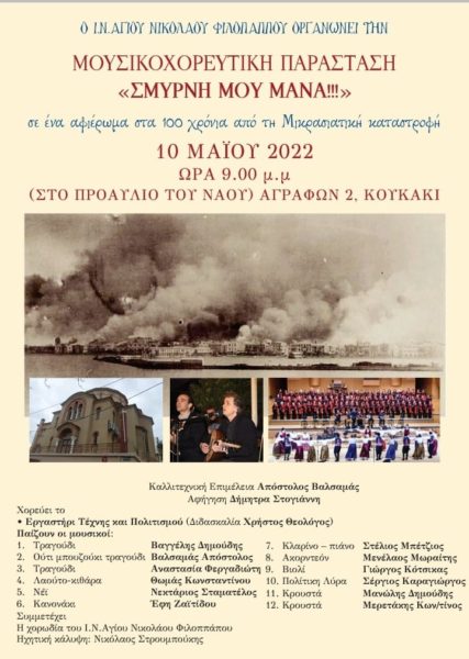 Με την ευκαιρία της δεύτερης εορτής του Αγίου Νικολάου (ο ναός του οποίου χτίστηκε από Μικρασιάτες πρόσφυγες στο Κουκάκι), η ενορία του Αγίου Νικολάου Φιλοπάππου, με την αμέριστη βοήθεια φίλων και πνευματικών τέκνων, διοργανώνει απόψε (10/5/2022) μουσικοχορευτική παράσταση/αφιέρωμα στα 100 χρόνια από τη Μικρασιατική Καταστροφή. Την εκδήλωση, που αρχίζει στις 9 το βράδυ, θα τιμήσει τραγουδώντας ο Βαγγέλης Δημούδης και μια όμορφη παρέα από εξαίρετους μουσικούς και χορευτές.