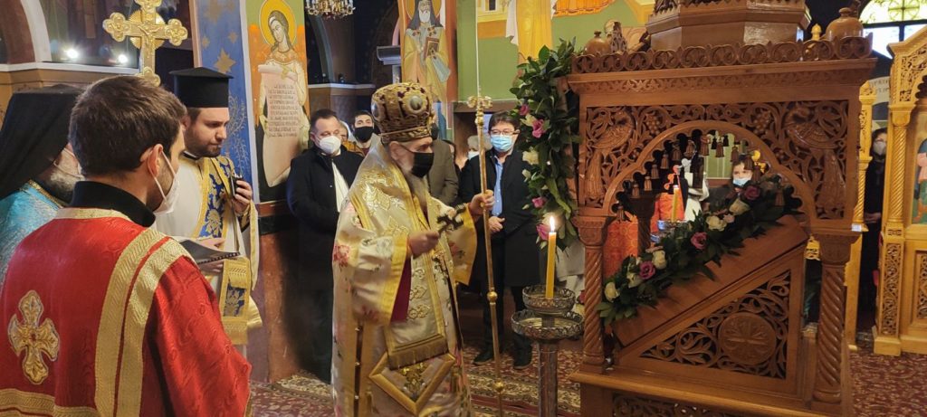 Την προεόρτια Κυριακή 13 Φεβρουαρίου, τέλεσε την Α΄ Θεία Λειτουργία ο μητροπολίτης Θαυμακού Ιάκωβος, ο οποίος προεξήρχε λιτανείας εντός του ναού και δεήσεως κατά του κορωναϊού. Μαζί του συλλειτούργησαν οι εκ των κληρικών του ναού, αρχιμανδρίτης Σεραφείμ Δημητρίου και διάκονος Γεώργιος Βάρσος. Ο μητροπολίτης στην ομιλία του, αμέσως μετά την ανάγνωση του ιερού Ευαγγελίου, είπε μεταξύ άλλων, “η Ευαγγελική περικοπή που διαβάζεται τρεις εβδομάδες πριν αρχίσει η μεγάλη και αγία τεσσαρακοστή και επειδή αρχίζει η έντονη λατρευτική δραστηριότητα και η έντονη θα λέγαμε περισυλλογή και προσοχή των πιστών για να ετοιμαστούμε για τη μεγάλη εορτή του Πάσχα, είναι δικαιολογημένο να έρχεται στο νου μας ότι, εφόσον εκκλησιαζόμαστε τακτικά, εφόσον κάνουμε ελεημοσύνη, εφόσον κάνουμε τις προσευχές μας και τις νηστείες μας και όλα τα θρησκευτικά μας καθήκοντα, έχουμε θα έλεγα πρόσωπο απέναντι στον Θεό. Αυτό είναι μια λανθασμένη εκτίμηση όλων των θρησκευτικών δυνατοτήτων που προσφέρει η Εκκλησία όπως είναι τα μέτρα τις προσευχές, της νηστείας, της ελεημοσυνης. Θα πρέπει ο πιστός να ξέρει ότι Εκείνος ο οποίος μας δίνει το έλεος, Εκείνος ο οποίος μας δίνει την ευλογία για να καρποφορήσει οποιαδήποτε προσπάθεια μας, είναι ο ίδιος ο Θεός. Θα πρέπει να γνωρίζουμε ότι καμία ενέργεια και καμιά πράξις και όλη μας την περιουσία να δώσουμε στους φτωχούς και όλο το εικοσιτετράωρο να προσευχόμαστε και οτιδήποτε καλό κάνουμε μέσα στη ζωή μας, είναι ένα θετικότατο στοιχείο για να μπορέσει να καλλιεργηθεί η ψυχή μας, αλλά όμως εκείνο το οποίο θα αξιοποιήσει όλες αυτές τις πράξεις μας είναι αν πάντοτε αναφερόμεθα εις τον Σταυρό του Κυρίου. Εάν πάντοτε μέσα εις την πνευματικήν μας πορεία είναι και κυριαρχεί ο Σταυρός του Κυρίου και τα απλωμένα χέρια του επί του Σταυρού καρφωμένα. Το αίμα του Κυρίου είναι εκείνο το οποίο φέρνει την λύτρωση εις τον άνθρωπον και το ανθρώπινο γένος διότι εκεί πλέον σταυρώθηκε ολόκληρη η αμαρτία του κόσμου και αυτός ο αναμάρτητος προσεφέρθηκε ως αμνός άμωμος για να μας δώσει την συγχώρεση και να μας δώσει την δυνατότητα να γίνουμε πάλι παιδιά του Θεού”.