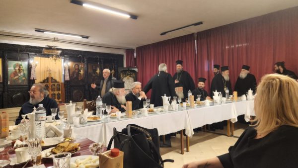 Μετά, στην υποκείμενη του ναού αίθουσα, προσήλθαν να ευχηθούν ο φιλοξενών άρχοντας και κυριάρχης, άγγελος της Εκκλησίας Περιστερίου Γρηγόριος, αφού είχε τελέσει προγραμματισμένη χειροτονία, ο Σεβασμιώτατος Μητροπολίτης Γλυφάδας κ. Αντώνιος και ο πάντων διάκονος, εργάτης της αγάπης επίσκοπος Ωρεών Φιλόθεος, ο και αρχιγραμματεύς της Ιεράς Συνόδου της Εκκλησίας της Ελλάδος.