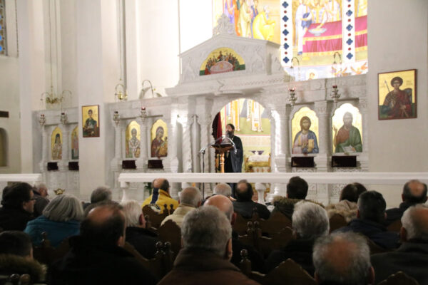 Οι πιστοί πλήρωσαν τον Ιερό Ναό και παρακολούθησαν με μεγάλο ενδιαφέρον την ομιλία του πρώτου καλεσμένου ομιλητή, Αρχιμ. Βαρνάβα Γιάγκου, Ηγουμένου της Ιεράς Μονής Αγίας Θεοδώρας Θεσσαλονίκης και Διευθυντού του Γραφείου Νεότητας της Αποστολικής Μητρόπολης των Θεσσαλονικέων.