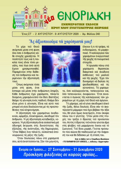 Με τίτλο «Ας αξιοποιήσουμε τα χαρίσματά μας» κυκλοφόρησε η νέα εβδομαδιαία έκδοση του Ιερού Ναού της Ευαγγελίστριας Πειραιώς. Το χέρι του Θεού σκόρπισε μέσα στη φύση όλα όσα ο άνθρωπος κάθε εοχής χρειάζεται… Η ποσότητα και η ποικιλία είναι πολύ μεγάλη και περιμένει τον άνθρωπο προς αξιοποίηση…