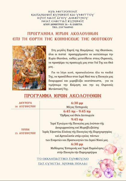 Ακολουθει το πλήρες πρόγραμμα της Εορτής της Κοιμήσεως της Παναγίας μας.