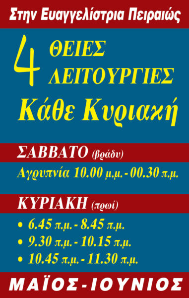 Στην Ενορία Ευαγγελιστρίας Πειραιώς, τηρώντας όλα τα απαραίτητα υγειονομικά μέτρα και την απαραίτητη διαμόρφωση του χώρου, για την αποφυγή του συνωστισμού και την προστασία των συμμετεχόντων, τελούνται κάθε Κυριακή 4 θείες Λειτουργίες.