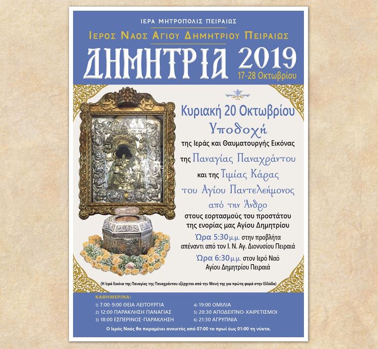 Ο Ιερός Ναός Αγίου Δημητρίου Πειραιώς διοργανώνει εορταστικές εκδηλώσεις με την επωνυμία «Δημήτρια 2019» από 17-28 Οκτωβρίου, προς τιμήν του Αγίου Δημητρίου του Μυροβλύτου. Στο Ναό θα τεθούν σε προσκύνηση η ιερά εικόνα της Παναγίας Παναχράντου και η Τιμία Κάρα του Αγίου Παντελεήμονος του Ιαματικού από την Άνδρο, η υποδοχή των οποίων θα γίνει την Κυριακή 20/10 στις 17:30 στο λιμάνι του Πειραιά έναντι Ιερού Ναού Αγίου Διονυσίου.