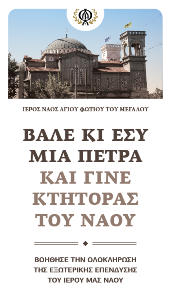 Ο Ιερός Ναός του Αγίου Φωτίου του Μεγάλου της Ιεράς Μητροπόλεως Θεσσαλονίκης διοργανώνει τη δράση “Βάλε και εσύ μια πέτρα, Γίνε και εσύ ο Κτήτορας του Ιερού μας Ναού” ώστε να συγκεντρώσει το ποσό για την εξωτερική επένδυση του Ναού από πέτρα στο βόρειο τμήμα καθώς υπάρχει ανάγκη αποπληρωμής του χρέους.