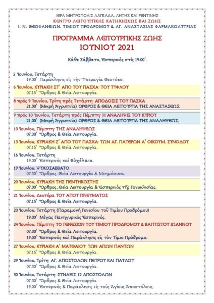Ακολουθεί το πρόγραμμα της Λειτουργικής ζωής της Μητροπόλεως Λαγκαδά για τον Ιούνιο του 2021.