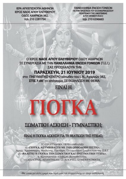 Ὁ Ἱ. Ν. Ἁγίου Ἐλευθερίου Ἀχαρνῶν σέ συνεργασία μέ τήν Πανελλήνια Ἕνωση Γονέων γιά τήν Προστασία τοῦ Ἑλληνορθοδόξου Πολιτισμοῦ τῆς Οἰκογενείας καί τοῦ Ἀτόμου (Π.Ε.Γ.) σᾶς προσκαλοῦν τήν ΠΑΡΑΣΚΕΥΗ, 21 ΙΟΥΝΙΟΥ 2019 στό Πνευματικό Κέντρο, κάτωθεν τοῦ Ἱ. Ν., Ἀχαρνῶν 382, στίς 7.00΄ τό ἀπόγευμα, σέ ἐκδήλωση μέ θέμα: Εἶναι ἡ ΓΙΟΓΚΑ Σωματική Ἄσκηση – Γυμναστική; – Εἶναι ἡ ΓΙΟΓΚΑ ἄσκηση γιά τή βελτίωση τῆς Ὑγείας;