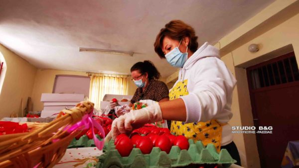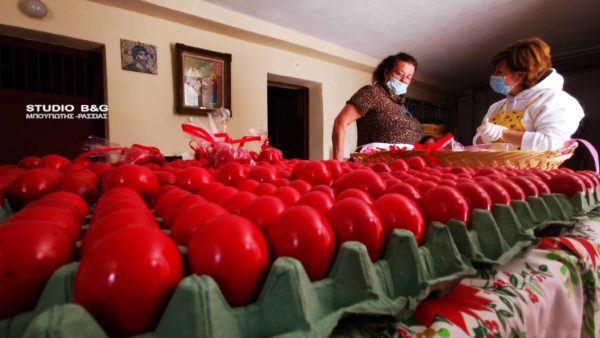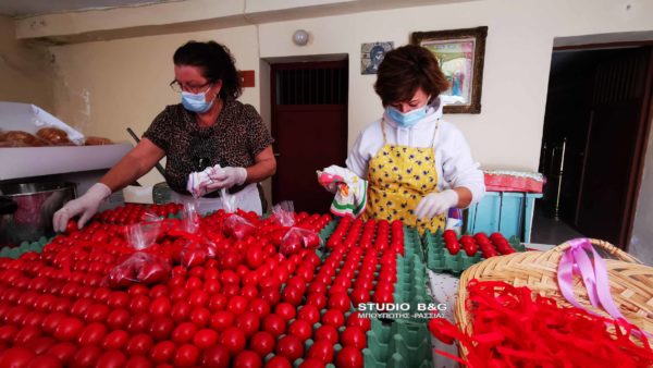 Οι εθελόντριες του συσσιτίου του Ιερού Ναού Ευαγγελιστρίας Ναυπλίου έβαψαν πάνω από 500 κόκκινα αυγά για την εορτή του Πάσχα. Το συσσίτιο του Ιερού Ναού Ευαγγελιστρίας θα διανείμει κανονικά φαγητό και ανήμερα του Πάσχα. Ο Ιερέας του ναού και υπεύθυνος του συσσιτίου π. Ελευθέριος Μίχος τόνισε πως κανένας πολίτης την ημέρα του Πάσχα δεν θα μείνει χωρίς γεύμα.