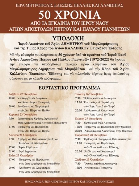 Η ενορία των Αγίων Αποστόλων Πέτρου και Παύλου Γιαννιτσών εορτάζει τα 50 χρόνια από τα εγκαίνια του Ιερού Ναού (1972-2022) με εόρτιες ακολουθίες και ποικίλες άλλες εκδηλώσεις που θα πραγματοποιηθούν από το Σάββατο 22 Οκτωβρίου έως το Σάββατο 29 Οκτωβρίου.