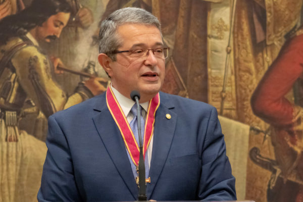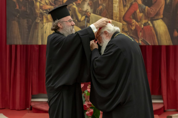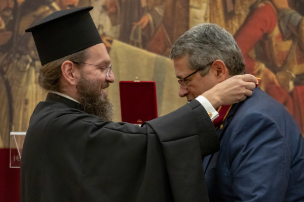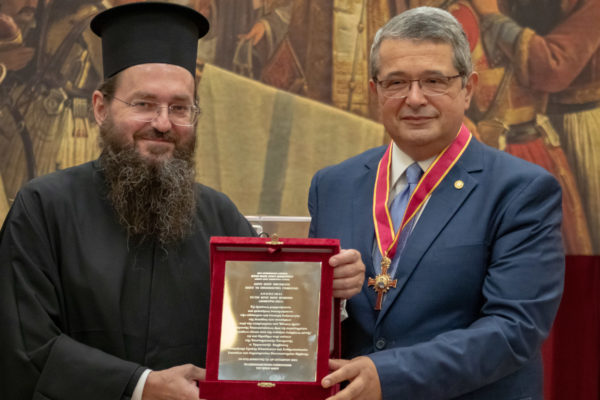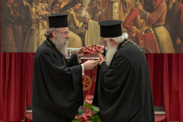 β) στον ελλογιμότητο Καθηγητή κ. Εμμανουήλ Βαρβούνη, Λαογράφο και Κοσμήτορα της Σχολής Κλασσικών και Ανθρωπιστικών Σπουδών του Δημοκριτείου Πανεπιστημίου Θράκης, ο οποίος εκπροσωπεί όλα τα Μέλη αυτής, από τον Θεοφιλέστατο εψηφισμένο Μητροπολίτη Πολυανής και Κιλκισίου κ. Βαρθολομαίο.