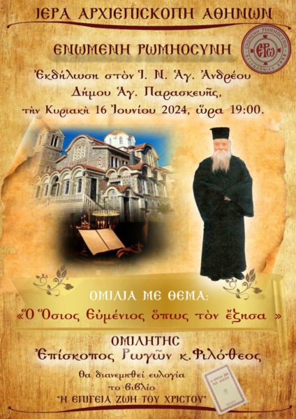 Την Κυριακή 16 Ιουνίου 2024 και εις ανάμνηση των Εγκαινίων του Ιερού Ναού Αγίου Ανδρέου Δήμου Αγίας Παρασκευής Αττικής, τα οποία τελέσθηκαν στις 10 Ιουνίου 2023, πραγματοποιείται στον Ιερό Ναό στις 7 μ.μ. με πρωτοβουλία της Ενωμένης Ρωμηοσύνης εκδήλωση με ομιλητή τον Θεοφιλέστατο Επίσκοπο Ρωγών κ.Φιλόθεο, ο οποίος θα μιλήσει μέσα από τις προσωπικές του εμπειρίες για τον Άγιο Ευμένιο Σαριδάκη (1η Ιανουαρίου 1931 – + 23 Μαΐου 1999).
