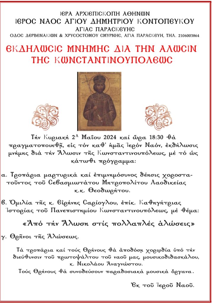 Εκδήλωση μνήμης για την επέτειο Άλωσης της Κωνσταντινούπολης θα πραγματοποιηθεί, την Κυριακή 2 Ιουνίου στις 18:30, στον Ιερό Ναό Αγίου Δημητρίου Κοντοπεύκου Αγίας Παρασκευής.