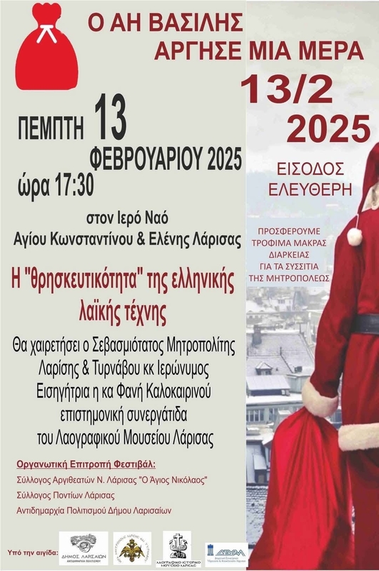Η Ιερά Μητρόπολη Λαρίσης και Τυρνάβου σε συνεργασία με τον Σύλλογο Αργιθεατών Ν. Λάρισας, τον Σύλλογο Ποντίων Λάρισας και την Αντιδημαρχία Πολιτισμού του Δήμου Λαρισαίων διοργανώνουν, την Πέμπτη 13 Φεβρουαρίου 2025 και ώρα 17.30, στον Ιερό Ναό Αγίων Κωνσταντίνου και Ελένης Λαρίσης, εκδήλωση – ομιλία, με θέμα: «Η «θρησκευτικότητα» της ελληνικής λαϊκής τέχνης».