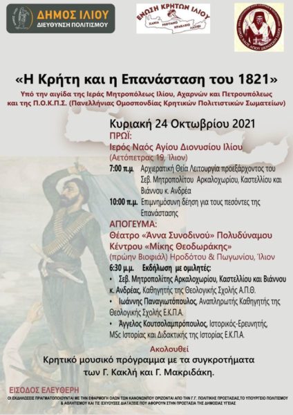H ενορία Αγίου Διονυσίου Ιλίου σε συνεργασία με τον Δήμο Ιλίου και την Ένωση Κρητών Ιλίου, διοργανώνει την Κυριακή 24 Οκτωβρίου εκδήλωση με αφορμή την συμπλήρωση 200 ετών από το ξέσπασμα της Ελληνικής Επαναστάσεως του 1821, με θέμα: «Η Κρήτη και η Επανάσταση του 1821».