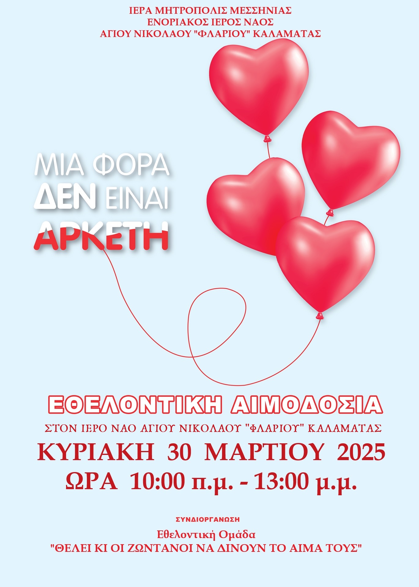 Το αίμα δεν είναι κάτι που εξαγοράζεται ή αποκτάται, αλλά δίνεται με αγάπη και πνεύμα θυσίας και προσφοράς και επειδή ο Ελύτης μας άφησε ως παρακαταθήκη τον στίχο: “Θέλει κι οι ζωντανοί να δίνουν το αίμα τους”, για τον λόγο αυτό, σε πνεύμα αγάπης και προσφοράς, ο Ενοριακός Ιερός Ναός Αγίου Νικολάου (Φλαρίου) Καλαμάτας, σε συνεργασία με φίλους και εθελοντές του Ναού, διοργανώνει την Κυριακή 30Μαρτίου 2025, την 6η Ημέρα Αγάπης και Προσφοράς.