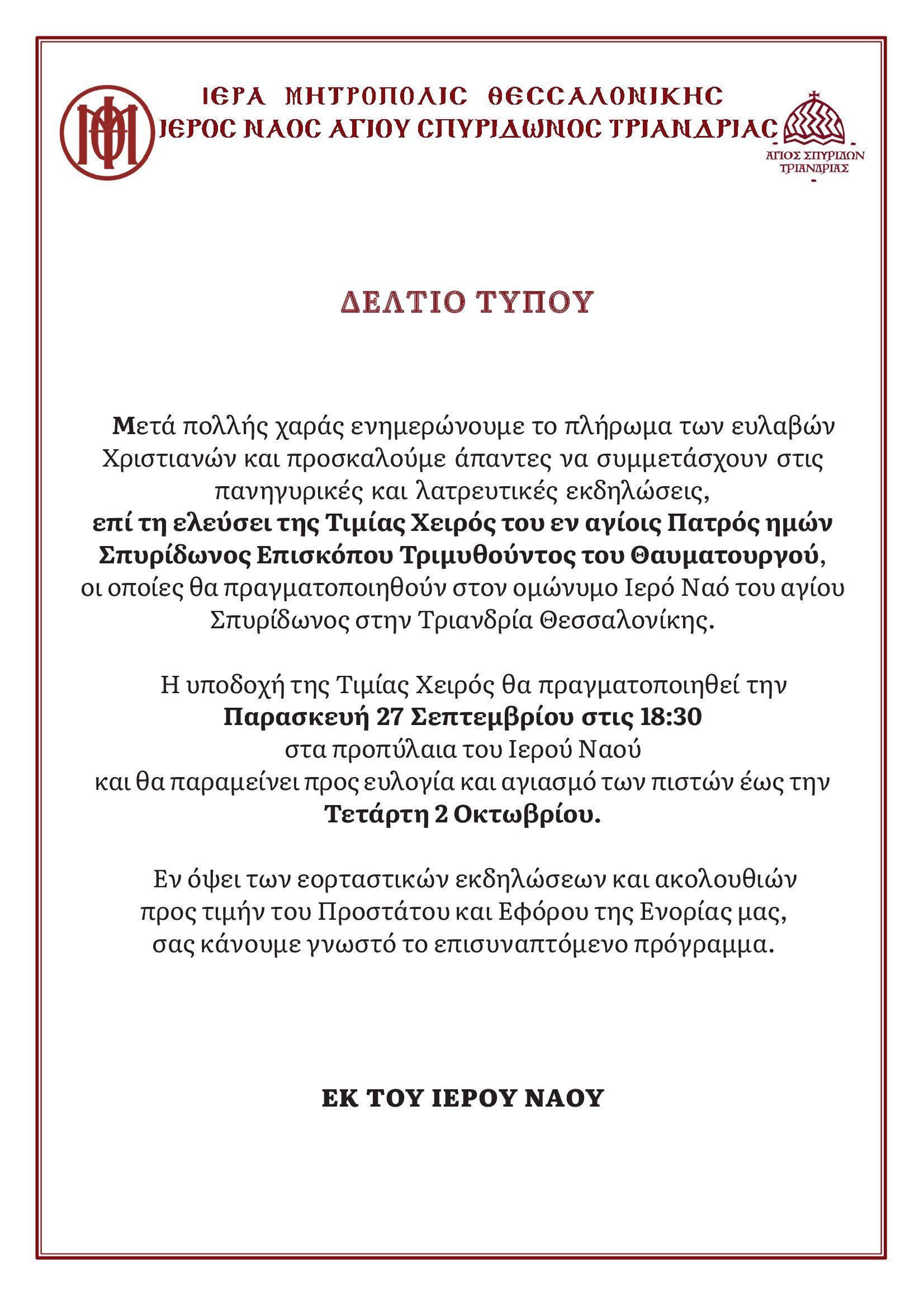 Μετά πολλής χαράς ο Ι.Ν. Αγίου Σπυρίδωνος στην Τριανδρία Θεσσαλονίκης ενημερώνει το πλήρωμα των ευλαβών Χριστιανών και προσκαλεί άπαντες να συμμετάσχουν στις πανηγυρικές και λατρευτικές εκδηλώσεις, επί τη ελεύσει της Τιμίας Χειρός του εν αγίοις Πατρός ημών Σπυρίδωνος Επισκόπου Τριμυθούντος του Θαυματουργού, οι οποίες θα πραγματοποιηθούν στον ομώνυμο Ιερό Ναό.