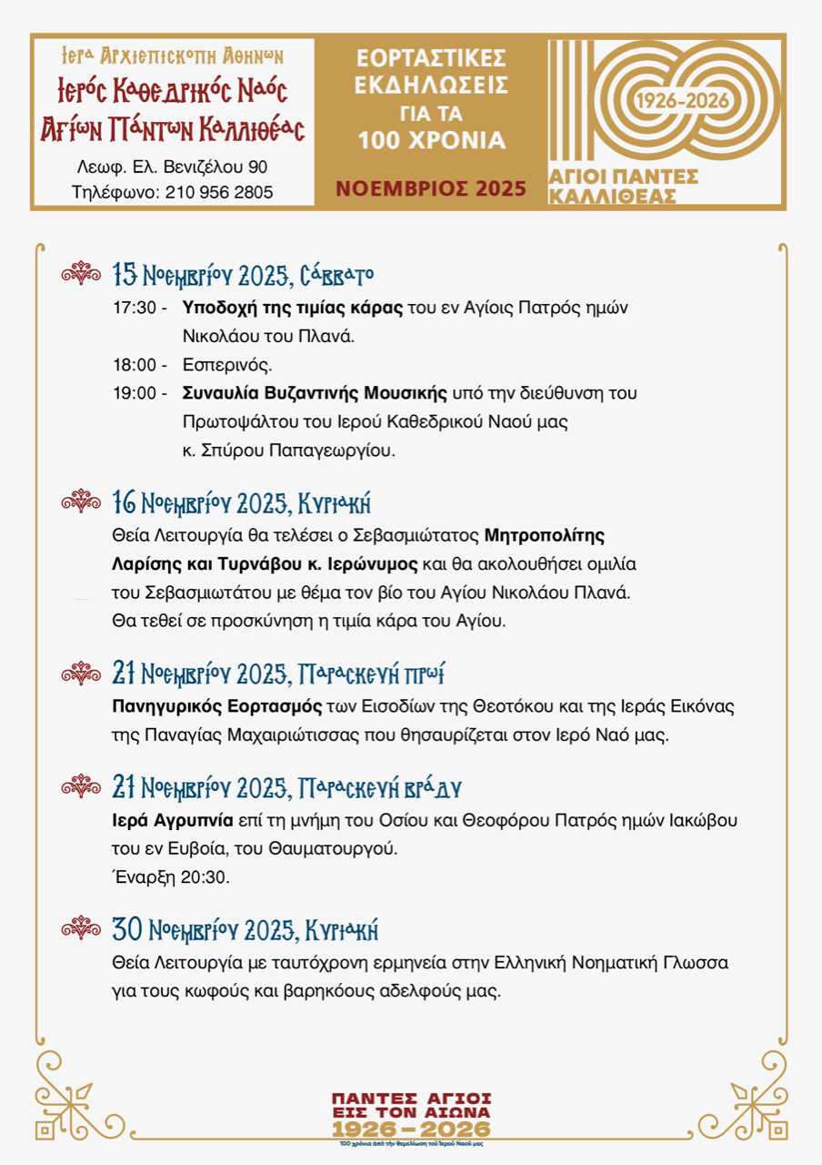 Όσο για την τελευταία Κυριακή του Νοεμβρίου (30/11), όπως και την τελευταία Κυριακή κάθε μήνα εδώ και πάρα πολλά χρονιά, στον Ιερό Ναό των Αγίων Πάντων η Θεία Λειτουργία θα τελεστεί με ταυτόχρονη ερμηνεία στην Ελληνική Νοηματική Γλώσσα για τους κωφούς και βαρηκόους αδελφούς μας.