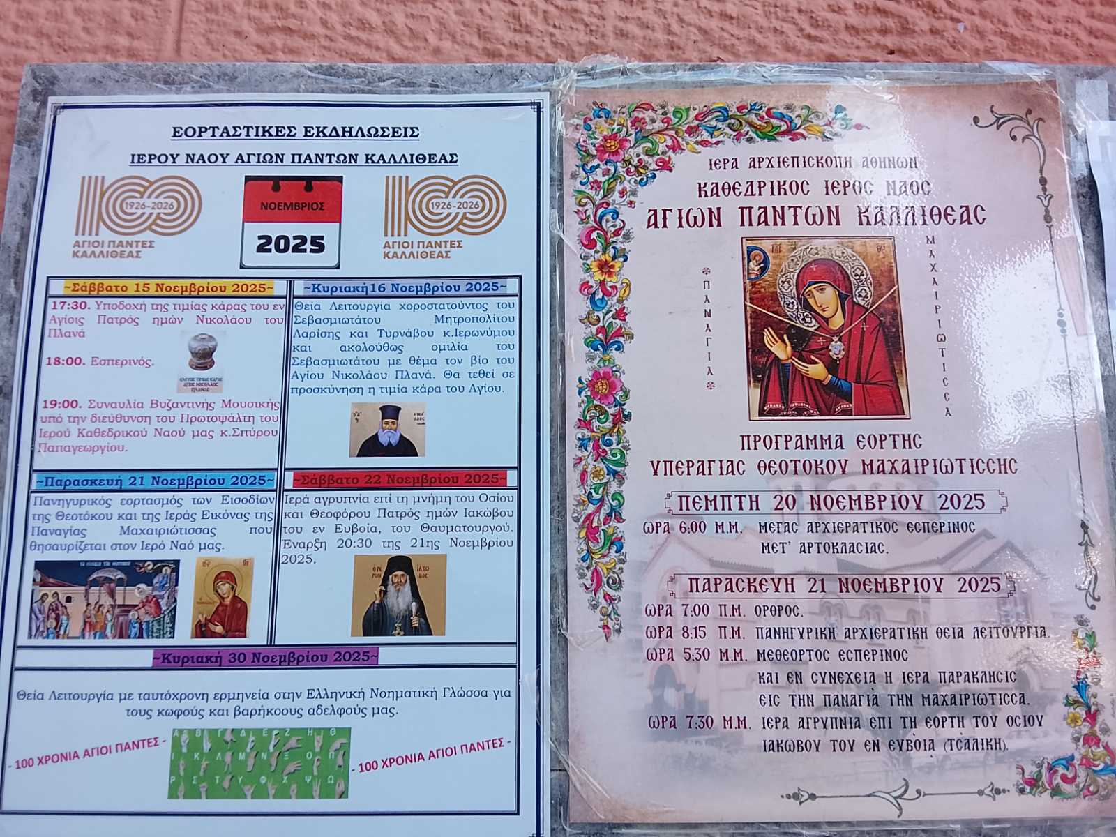Την ημέρα των Εισοδίων της Θεοτόκου, Παρασκευή 21 Νοεμβρίου,θα τελεστεί η πανηγυρική Θεία Λειτουργία, αφού στον Ιερό Ναό των Αγίων Πάντων θησαυρίζεται και η Ιερά Εικόνα της Παναγίας της Μαχαιριώτισσας, που τιμάται αυτή την ημέρα.