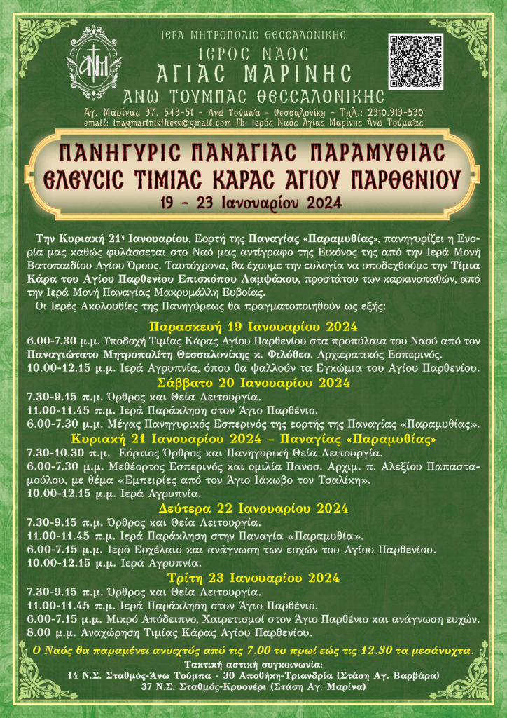 Την Κυριακή 21 Ιανουαρίου, Εορτή της Παναγίας της επονομαζομένης «Παραμυθίας», πανηγυρίζει η Ενορία Αγίας Μαρίνης Άνω Τούμπας καθώς φυλάσσεται στον Ιερό Ναό αντίγραφο της Εικόνας της από την Ιερά Μεγίστη Μονή Βατοπαιδίου Αγίου Όρους. Ταυτόχρονα με την Πανήγυρη, θα γίνει η υπδοχή της Τιμίας Κάρας του Αγίου Παρθενίου Επισκόπου Λαμψάκου, προστάτη των καρκινοπαθών αδελφών, από την Ιερά Μονή Παναγίας Μακρυμάλλη Ευβοίας.