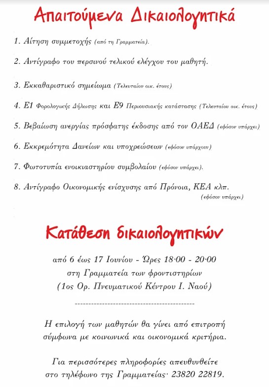 Για περισσότερες πληροφορίες απευθυνθείτε τις ίδιες ώρες στο τηλ.: 23820 22819.