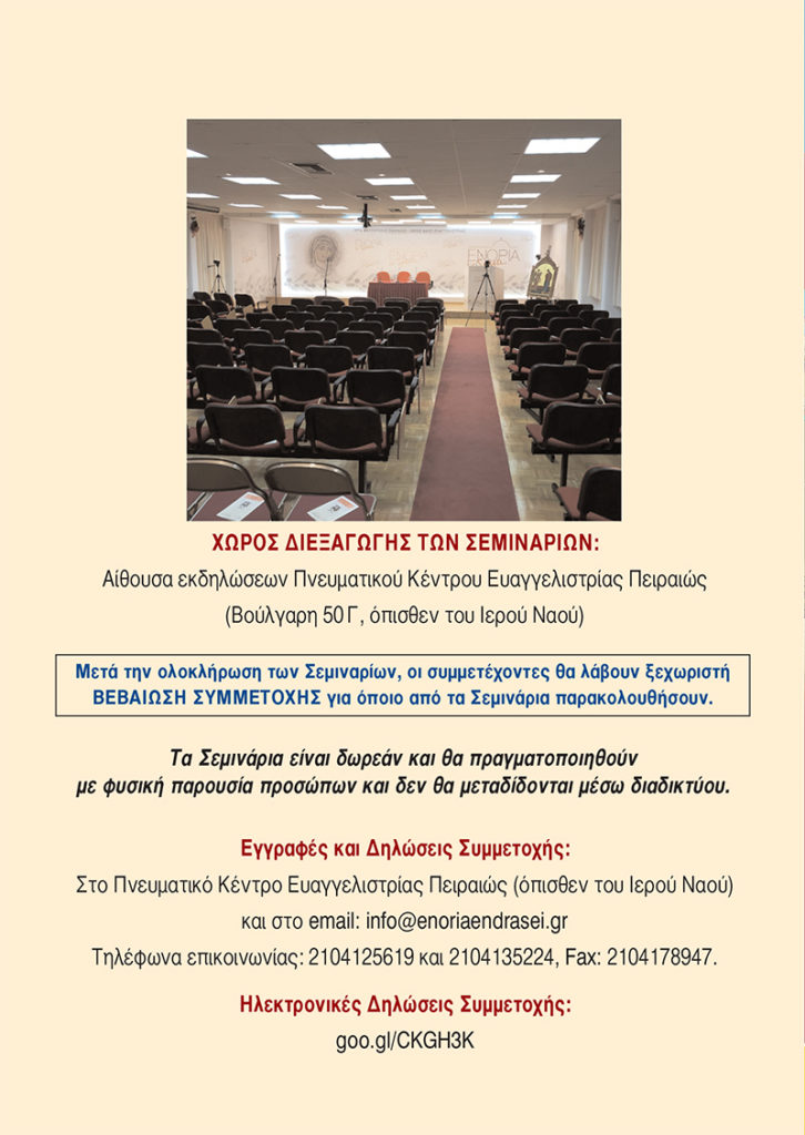 Αίθουσα εκδηλώσεων Πνευματικού Κέντρου Ευαγγελιστρίας Πειραιώς (Βούλγαρη 50Γ, όπισθεν του Ιερού Ναού).