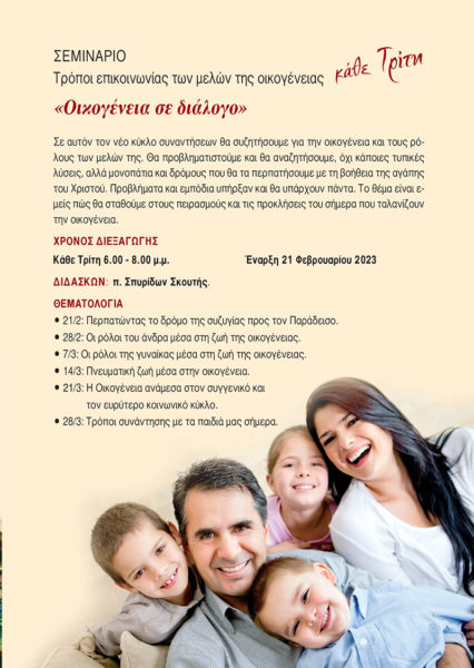 Σε αυτόν τον νέο κύκλο συναντήσεων θα συζητήσουμε για την οικογένεια και τους ρόλους των μελών της. Θα προβληματιστούμε και θα αναζητήσουμε, όχι κάποιες τυπικές λύσεις, αλλά μονοπάτια και δρόμους που θα τα περπατήσουμε με τη βοήθεια της αγάπης του Χριστού. Προβλήματα και εμπόδια υπήρξαν και θα υπάρχουν πάντα. Το θέμα είναι εμείς πώς θα σταθούμε στους πειρασμούς και τις προκλήσεις του σήμερα που ταλανίζουν την οικογένεια.