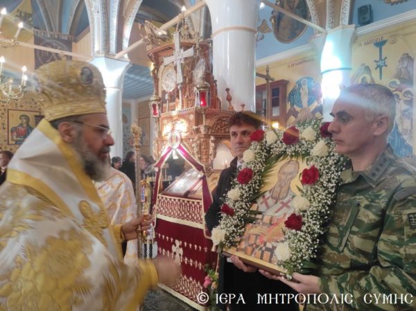 Παραμονή της εορτής τελέσθηκε ο Μέγας Πανηγυρικός Εσπερινός, χοροστατούντος του Σεβασμιωτάτου κ. Χρυσοστόμου, συμπαραστατουμένου εκ του Εφημεριακού Κλήρου της Σύμης. Προσήλθαν ευάριθμοι πιστοί για να ανάψουν το κερί τους, να προσκυνήσουν το χαριτόβρυτο απότμημα του αγίου Λειψάνου και να προσευχηθούν στον άτλαντα αυτόν της υγιούς πίστεως, που κατατρόπωσε τις αιρετικές δοξασίες του Αρείου, στερεώνοντας την Ορθοδοξία. Εν συνεχεία στην παρακείμενη ενοριακή αίθουσα, προσεφέρθη εόρτια Τράπεζα.
