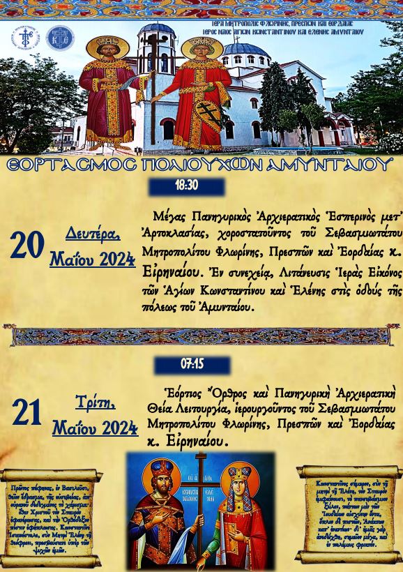 Εόρτιος Όρθρος και Πανηγυρική Αρχιερατική Θεία Λειτουργία θα τελεστεί ιερουργούντος του Μητροπολίτη Φλωρίνης, Πρεσπών και Εορδαίας κ. Ειρηναίου, στις 21 Μαΐου, ημέρα κατά την οποία η Εκκλησία τιμά την μνήμη των Αγίων Κωνσταντίνου και Ελένης Πολιούχων Αμυνταίου.