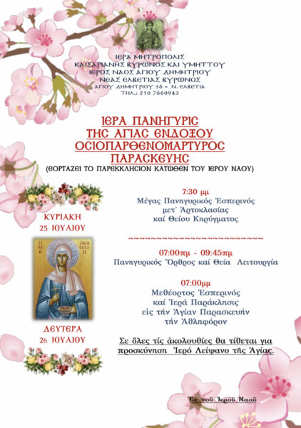 Εορτάζει το Ιερό Παρεκκλήσιο της Αγίας Παρασκευής κάτωθεν του Ιερού Ναού του Αγίου Δημητρίου Νέας Ελβετίας Βύρωνος, εκεί όπου δακρύζει και μυροβλύζει επί μήνες η Ιερά Εικόνα της Παναγίας της Παρηγορήτριας.