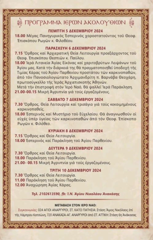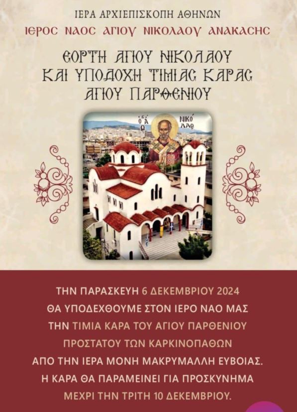 Την Παρασκευή 6 Δεκεμβρίου στον Ιερό Ναό Αγίου Νικολάου Ανακάσης θα γίνει η υποδοχή της Τιμίας Κάρας Αγίου Παρθενίου Προστάτη των Καρκινοπαθών από την Ιερά Μονή Μακρυμάλλη Ευβοίας. Η Τιμία Κάρα θα παραμείνει για προσκύνημα έως την Τρίτη 10 Δεκεμβρίου.