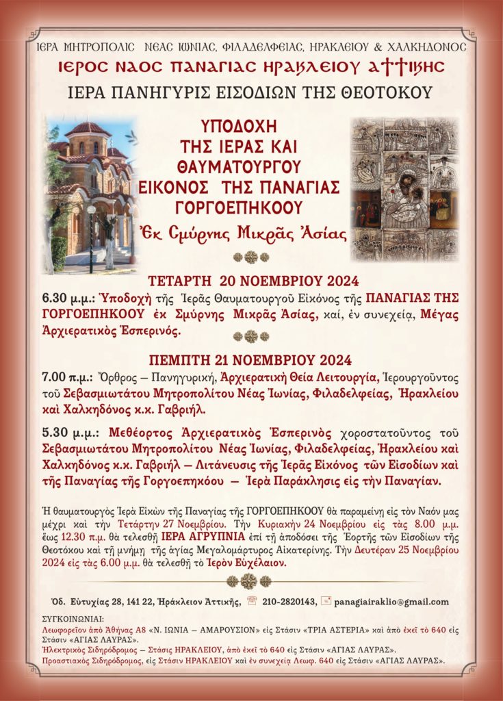 Ώρα 5:30μ.μ.: Μεθέορτος Αρχιερατικός Εσπερινός, χοροστατούντος του Σεβασμιωτάτου Μητροπολίτου Νέας Ιωνίας, Φιλαδελφείας, Ηρακλείου και Χαλκηδόνος κ.κ. Γαβριήλ και εν συνεχεία λιτάνευση της Ιεράς Εικόνος των Εισοδίων και της Παναγίας της Γοργοεπηκόου – Ιερὰ Παράκλησις εις την Παναγίαν.