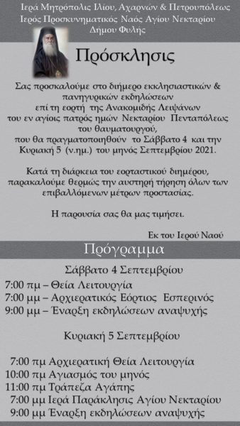 Πανηγυρικά θα εορτάσουν την εορτή της ανακομιδής των ιερών λειψάνων του Αγίου Νεκταρίου το διήμερο που θα πραγματοποιηθούν στις 4 και 5 Σεπτεμβρίου 2021.
