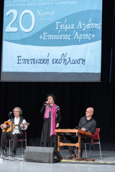 Σε κλίμα συγκίνησης πραγματοποιήθηκε η επετειακή εκδήλωση για τα είκοσι χρόνια συνεχούς λειτουργίας του Γεύματος Αγάπης «Επιούσιος Άρτος» της ενορίας Αγίου Γεωργίου Γιαννιτσών. Η εκδήλωση έγινε στο Πνευματικό Κέντρο του Δήμου Πέλλας στα Γιαννιτσά την Κυριακή 19 Νοεμβρίου.