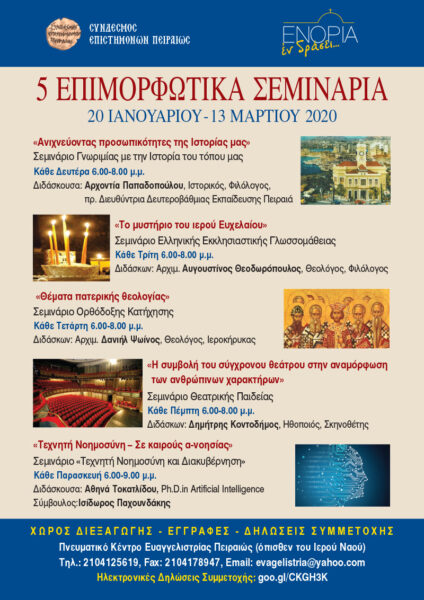 Το πρόγραμμα «ΕΝΟΡΙΑ εν δράσει» του Ιερού Ναού Ευαγγελίστριας Πειραιώς και ο Σύνδεσμος Επιστημόνων Πειραιώς διοργανώνουν και τη φετινή χρονιά πέντε Σεμινάρια, διάρκειας οκτώ εβδομάδων.