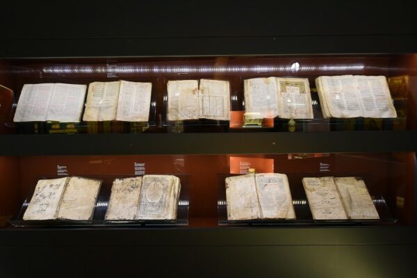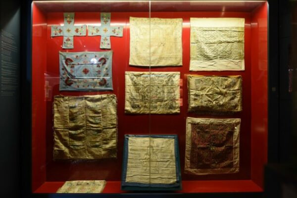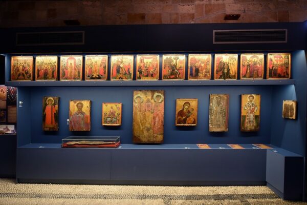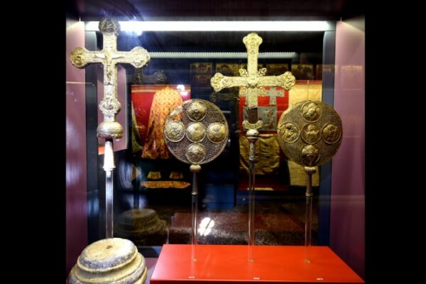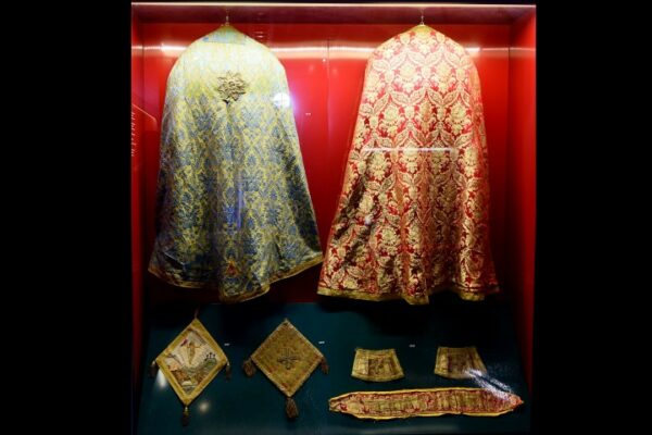 Σε μία καλαίσθητη πρόσφατα εγκαινιασθείσα έκθεση που φιλοξενείται στα βόρεια του Ιερού Ναού της Κοιμήσεως της Θεοτόκου, στο χώρο όπου άλλοτε χρησιμοποιήθηκε ως ταφικό παρεκκλήσιο, παρουσιάζονται τα κειμήλια που φυλάσσονταν μέχρι πρότινος στα σκευοφυλάκια του ναού.