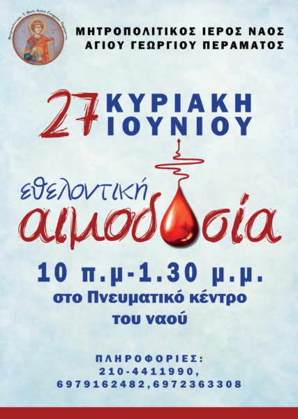 Εθελοντική αιμοδοσία διοργανώνει, την Κυριακή 27 Ιουνίου, σε συνεργασία με το Νοσοκομείο Τζάνειο του Πειραιά, ο Ιερός Ναός Αγίου Γεωργίου Περάματος.