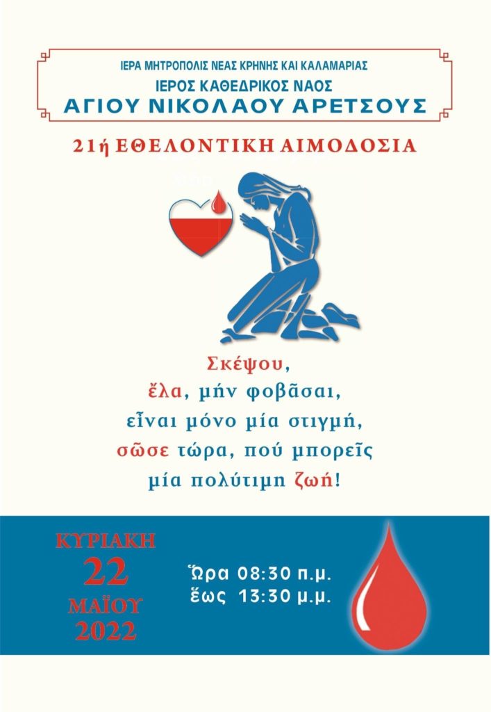 Την Κυριακή 22 Μαΐου 2022 από τις 8:30 μέχρι τη 13:30 θα πραγματοποιηθεί η 21η εθελοντική αιμοδοσία στον Ιερό Καθεδρικό Ναό Αγίου Νικολάου Αρετσούς.
