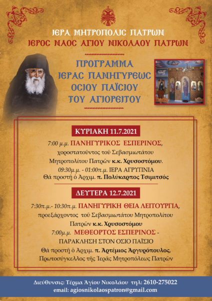 Την Πέμπτη 8/7/2021 τελέστηκε η Ακολουθία του Ιερού Ευχελαίου από τον Αρχιμ. π. Ιωακείμ Σταματόπουλο και ακολούθως Ιερά Αγρυπνία, ενώ την Παρασκευή 9/7/2021 εψάλη ο Εσπερινός και η Ακολουθία των Χαιρετισμών του Οσίου Παϊσίου του Αγιορείτου. Προέστη ο Πρωτ. π. Περικλής Ρίπισης.