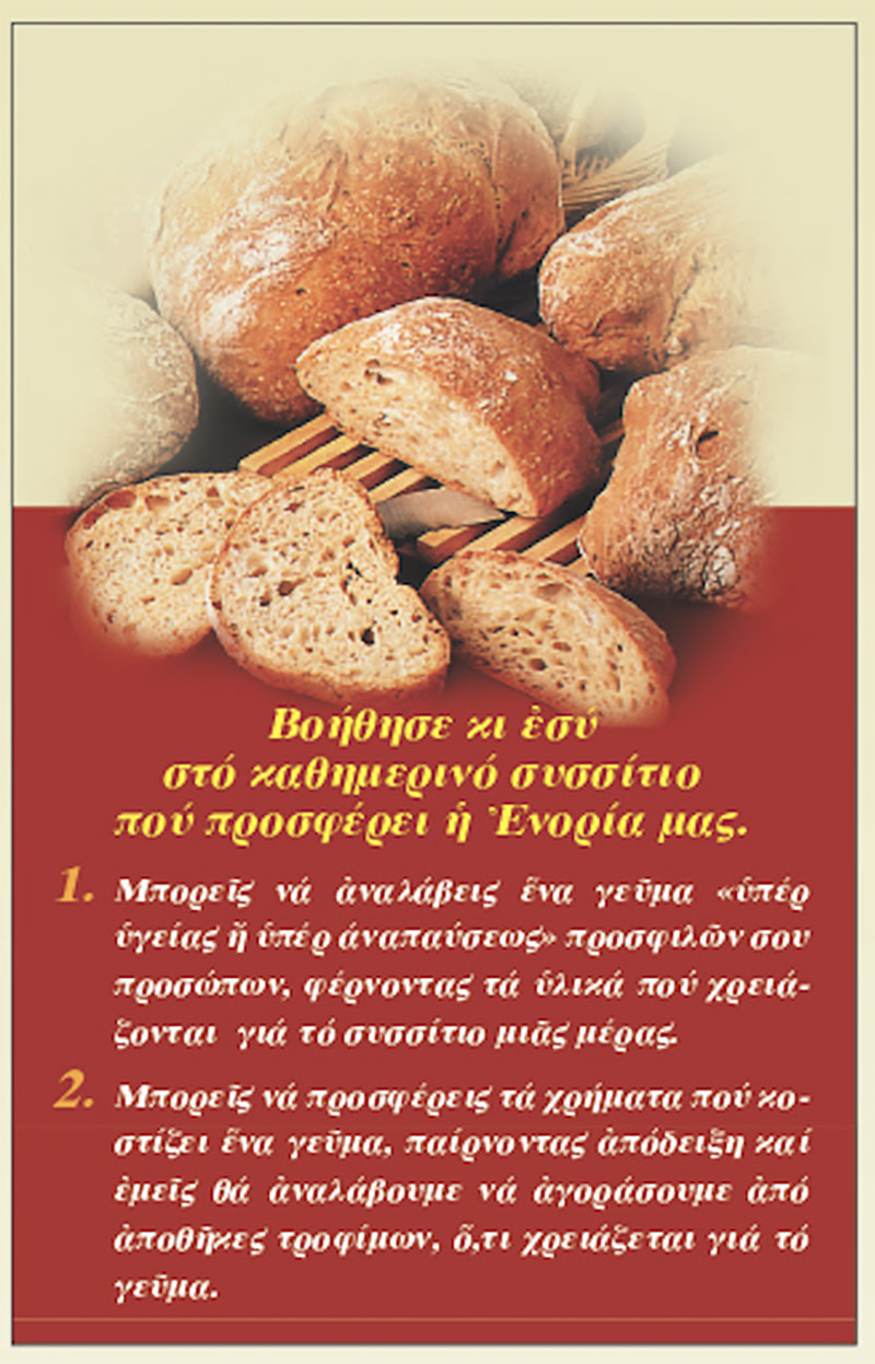 Θυμίζουμε ότι περισσότεροι από 120 άποροι αδελφοί μας εξυπηρετούνται καθημερινά, χάρη στις δωρεές και την εθελοντική εργασία κυριών της Ενορία μας.