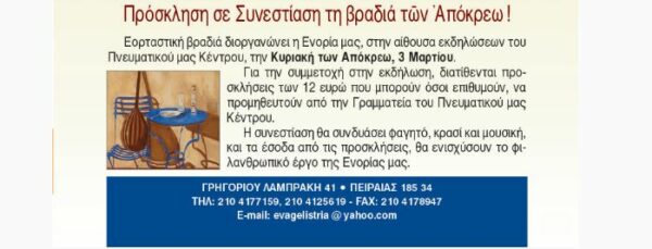 Ευαγγελίστρια Πειραιώς: Πρόσκληση σε Συνεστίαση τη βραδιά των Απόκρεω