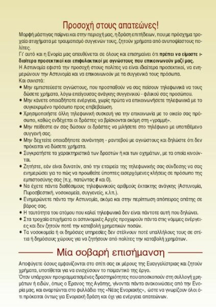 Μορφή μάστιγας έχει πάρει στην περιοχή η δράση επιτηδείων, που με πρόσχημα τροχαία ατυχήματα με τραυματισμό συγγενών τους, ζητούν χρήματα. Επίσης, αποφύγετε όσους εμφανίζονται στο σπίτι σας εκ μέρους της Ευαγγελίστριας και ζητούν χρήματα, υποτίθεται για να ενισχύσουν το ποιμαντικό έργο της Ενορίας.