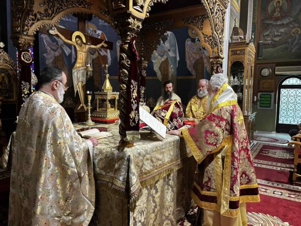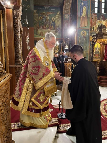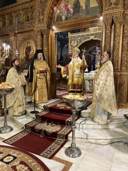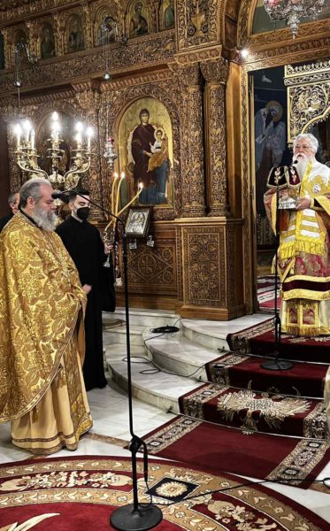 Προ της Απολύσεως, ο Προϊστάμενος του Ιερού Ναού π. Συμεών Βενετσιάνος, διερμηνεύοντας τα αισθήματα των Ιερέων και του εκκλησιάσματος, ευχήθηκε στον Σεβασμιώτατο η Παναγία Φανερωμένη να του φανερώνει δρόμους ειρήνευσης, συνεργασίας και συνοδοιπορίας στη νέα διακονία που τού εμπιστεύεται η Εκκλησία –όπως και ο ίδιος ο Σεβασμιώτατος άλλωστε επιθυμεί-, δωρίζοντάς του εκ μέρους του Ι. Ναού και την ιερά εικόνα της Παναγίας Φανερωμένης. Συλλειτούργησαν οι Εφημέριοι του Ι. Ναού π. Ιωάννης Καλογερόπουλος και π. Κωνσταντίνος Στούμπος. Τα ιερά αναλόγια υπηρέτησαν ο Πρωτοψάλτης κ. Γεώργιος Χατζηχρόνογλου και ο Λαμπαδάριος κ. Διονύσιος Θανασούλης. Παρέστη ο Δήμαρχος Παπάγου- Χολαργού κ. Ηλίας Αποστολόπουλος και πλήθος ενοριτών, οι οποίοι συνεχάρησαν και ευχήθηκαν καταλλήλως στον Σεβασμιώτατο.