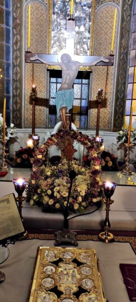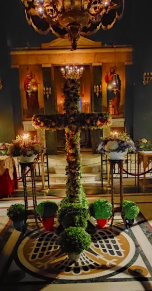 Ο στολισμός του Σταυρού ήταν και φέτος αρχοντικός, μοσχοβολιστός, πυκνός, εικόνα νίκης και σωτηρίου χαρμολύπης υπό το φως των κεριών που μοιράστηκαν προς το εκκλησίασμα και συνόδευσαν την ιερά αγρυπνία.