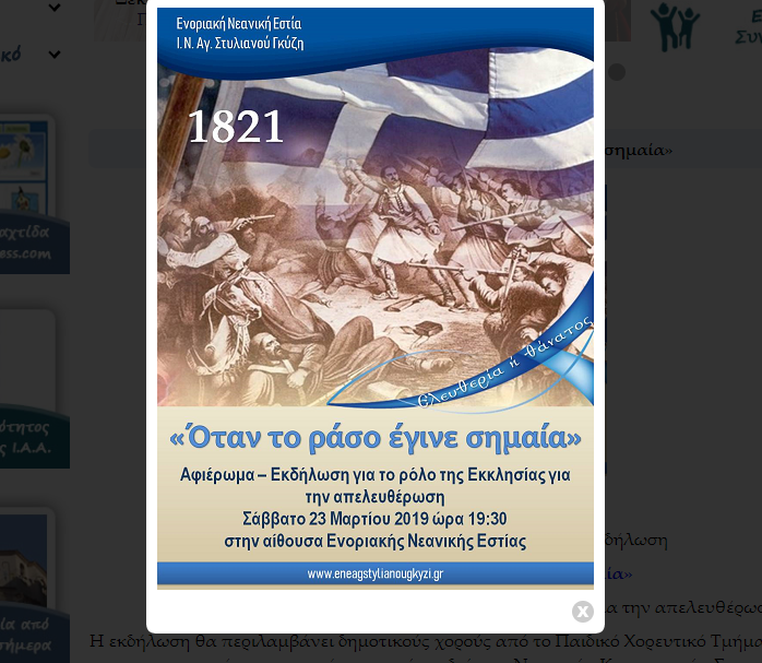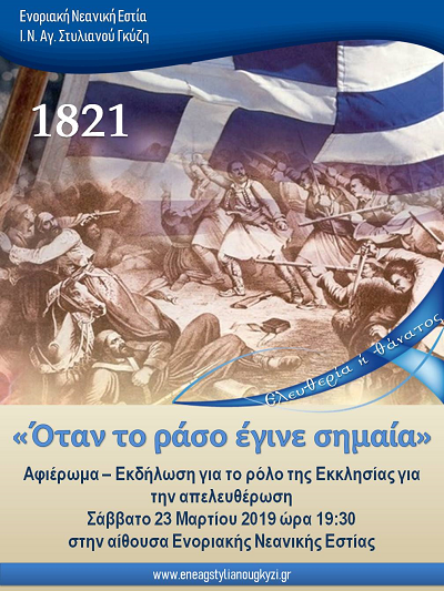 Η Ενοριακή Νεανική Εστία Αγίου Στυλιανού Γκύζη, μάς προσκαλεί στην Εθνική Εκδήλωση «Όταν το ράσο έγινε σημαία», ένα μικρό αφιέρωμα στον ρόλο της Εκκλησίας για την απελευθέρωση. Η εκδήλωση θα περιλαμβάνει δημοτικούς χορούς από το Παιδικό Χορευτικό Τμήμα της Ενορίας, αφηγήσεις και ποιήματα από παιδιά των Νεανικών Κατηχητικών Συντροφιών.